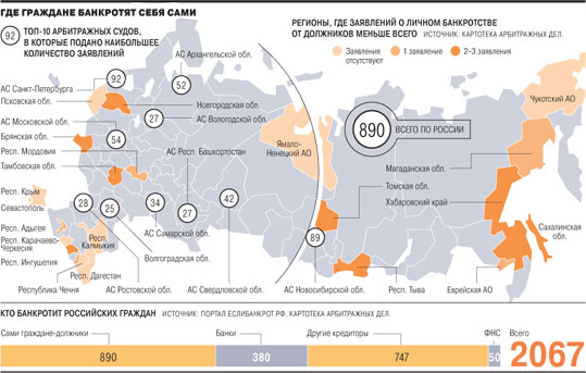 Почти половину заявлений о своем банкротстве подали сами граждане. ФССП РФ сообщала в начале октября, что Москва и Московская область лидируют по числу граждан, просроченные долги которых превышают 500 тыс. руб., но, как выяснилось, именно эти граждане не спешат себя банкротить. В Москве должниками подано всего 13 заявлений о личном банкротстве, в Мособласти — 54. В других регионах ситуация очень разная. По данным КАД, на 28 октября лидирует арбитражный суд Санкт-Петербурга и Ленинградской области с 92 обращениями, на втором месте — Новосибирская область (89 заявлений).