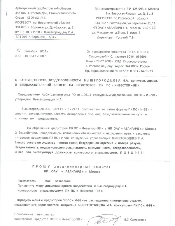 24 декабря в г. Новочеркасске состоялось очередное собрание инициативной группы кредиторов «Инвестор 98». Основной темой собрания являлся вопрос о назначении нового арбитражного управляющего. На эту должность рассматривается кандидатура Вышегородцева Игоря Алексеевича, главы Воронежского филиала саморегулируемой организации (СРО) «Авангард». Для вступления управляющего в должность необходимо прежде всего собрание минимум пятидесяти процентов пайщиков, это является приоритетным условием. Вообще процедура назначения долговременная и трудоемкая, но возможно «игра стоит свеч». Процедура признания банкротства длится уже третий год и пока никаких положительных результатов не наблюдается. В свое время организаторы кооператива поставили руководить процессом банкротства организацию арбитражных управляющих «Содействие» (г. Орёл). Управляющие из этой организации не предпринимали никаких мер по возврату денег пайщиков и не предоставляли пайщикам, в том числе и комитету кредиторов информации и документов о том, как проходит процесс банкротства. Одного управляющего — Овчинникова И.Е. — отстранили за ненадлежащее исполнение своих обязанностей, но поставили нового — Таланова И.Ю., который также бездействовал. Не возбуждены уголовные дела в отношении главного бухгалтера центрального офиса и руководителей и главных бухгалтеров филиалов ПК «ПС «Инвестор-98″. Не возбуждены уголовные дела в отношении 15 человек, за которыми числятся крупные займы, переданные им «Инвестором-98″ и до сих пор не возвращенные. При этом все обвиняемые, кроме одного, на данный момент на свободе и беспрепятственно продолжают деятельность по сокрытию своего имущества, не говоря уже о том, что они и сами могут скрыться в любой момент. Возможно с назначением нового арбитражного управляющего дело наконец сдвинется с «мертвой точки» и люди, обманутые руководством кооператива все же добьются справедливости и смогут вернуть свои деньги. Несмотря ни на что, многие еще не опустили руки и не бездействуют, а продолжают искать способы борьбы за свои права, и это дает надежду на победу.