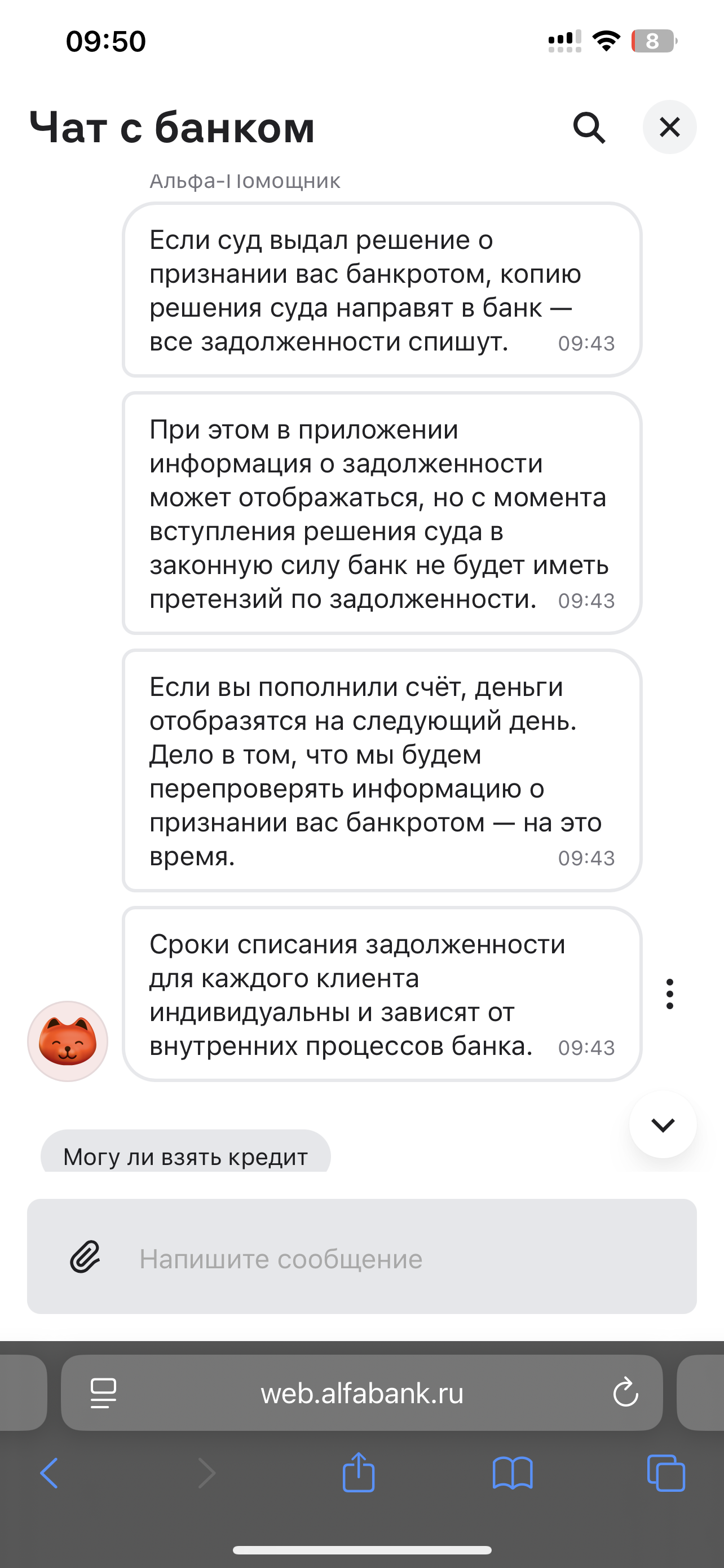 Прошла процедуру внесудебного банкротства, завершилось 3 мая. Интересно когда снимает аресты альфа банк? Ведь другие банки еще давно сняли аресты, даже сбер, там один только остался и они сообщение написали, что в течении 5 дней снимут все аресты. В других вообще ничего не осталось, а вот в альфе целых 11 арестов, есть даже арест, который давным давно закрылся, так как они продали долг. В чате пишут что снятие арестов у всех индивидуально, как это понимать, ведь по закону должны тоже в течении 5 дней все сделать?