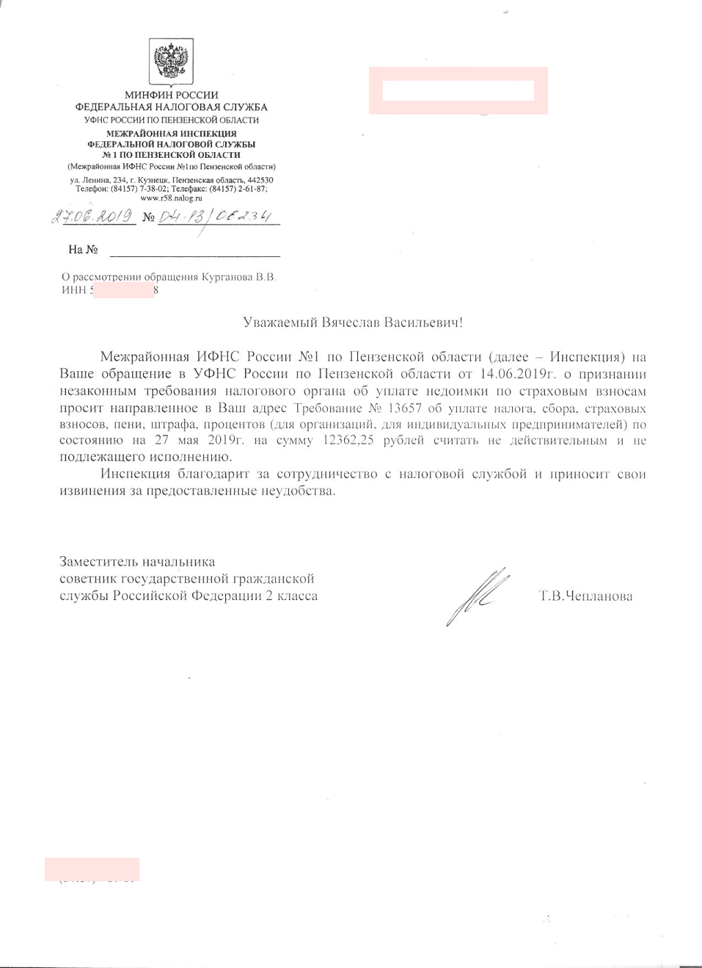 Рано радовались. http://kad.arbitr.ru/PdfDocument/8c...f854c/A51-14868-2018_20190617_Opredelenie.pdf - Верховный суд вернул кассационную жалобу без рассмотрения по существу. От ИФНС по Ленинскому району г. Владивостока поступило ходатайство об отзыве жалобы. К чему бы это?