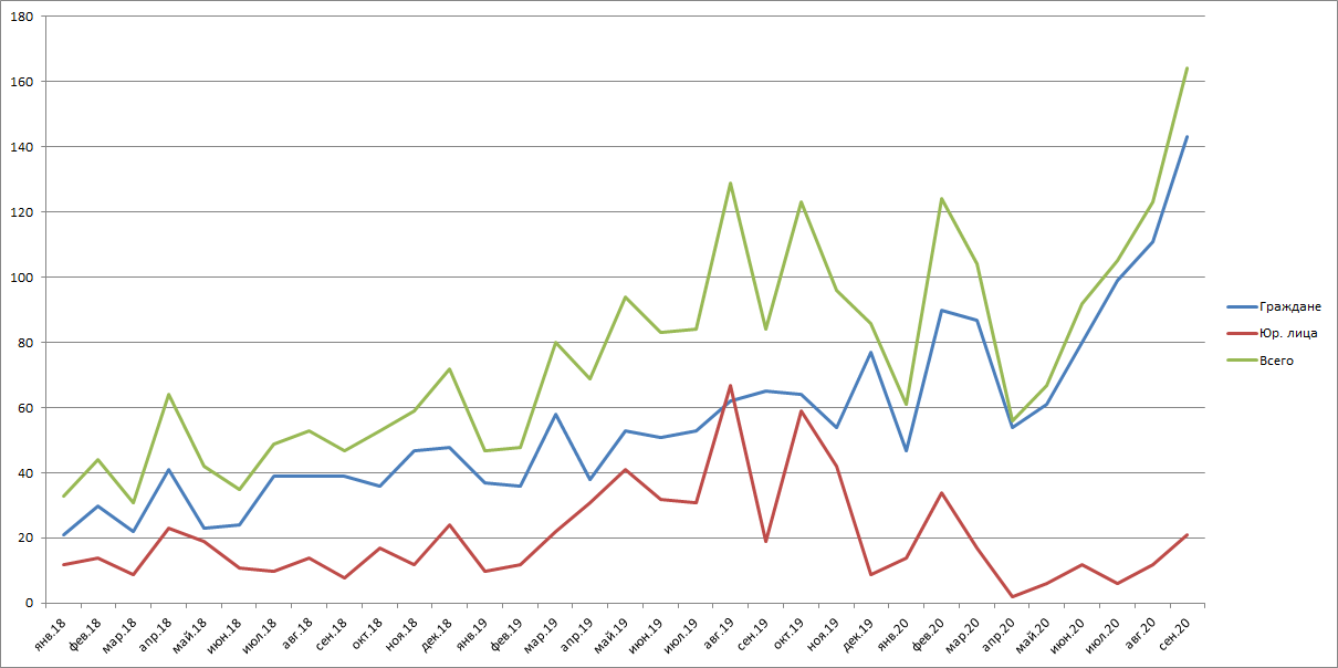 за 2020 год подано 1311 заявления (1146 по ФЛ, 165 по ЮЛ),