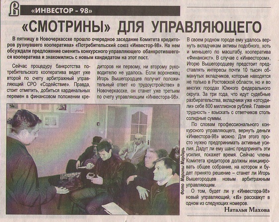 - На наш взгляд, грамотными. Председатель инициативной группы говорил нам, что собрано много тысяч подписей пайщиков, в арбитражный суд отправлены письма с требованиями отменить процедуру банкротства - точнее, его первую процедуру – наблюдение. Мы не поддерживаем такие действия. Во-первых, даже если по каким-либо причинам (процессуальным нарушениям) производство по делу о банкротстве сегодня будет прекращено, то завтра оно будет возобновлено вновь: по заявлению на этот раз уже не должника («Инвестора-98»), а кредитора или уполномоченного органа (налоговой инспекции). Потому что признаки банкротства налицо (долг свыше 100 тысяч и просрочка свыше 3-х месяцев), и никуда от этого не денешься. Во-вторых, арбитражный суд, заваленный письмами пайщиков, объективнее и справедливей не станет. Судьи просто не станут читать бумаги, написанные не по требованиям Арбитражно-процессуального кодекса. Более того, такие действия могут быть расценены как попытки давления на суд и отвергнуты им в категорической форме! Мы говорили об этом пайщикам, но не были услышаны. А через несколько дней Арбитражный суд Ростовской области разослал в средства массовой информации пресс-релиз, в котором было заявлено: