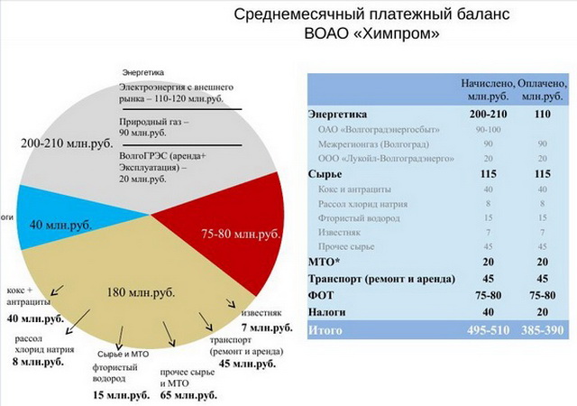 При этом все платежи ВОАО «Химпром» в месяц составляют около 400 миллионов рублей и, за исключением платежей в адрес энергетиков, исполняются ежемесячно в полном объеме.