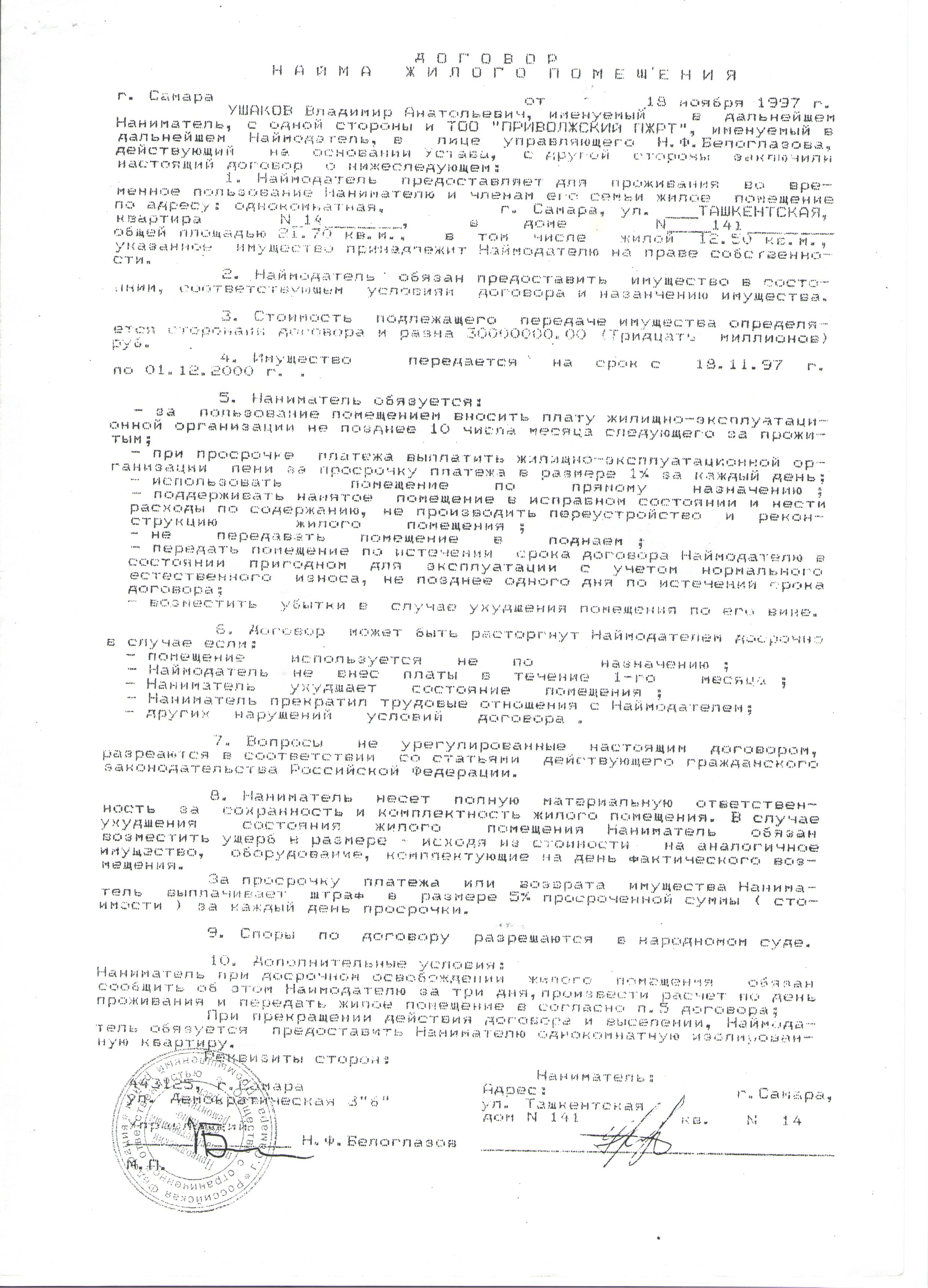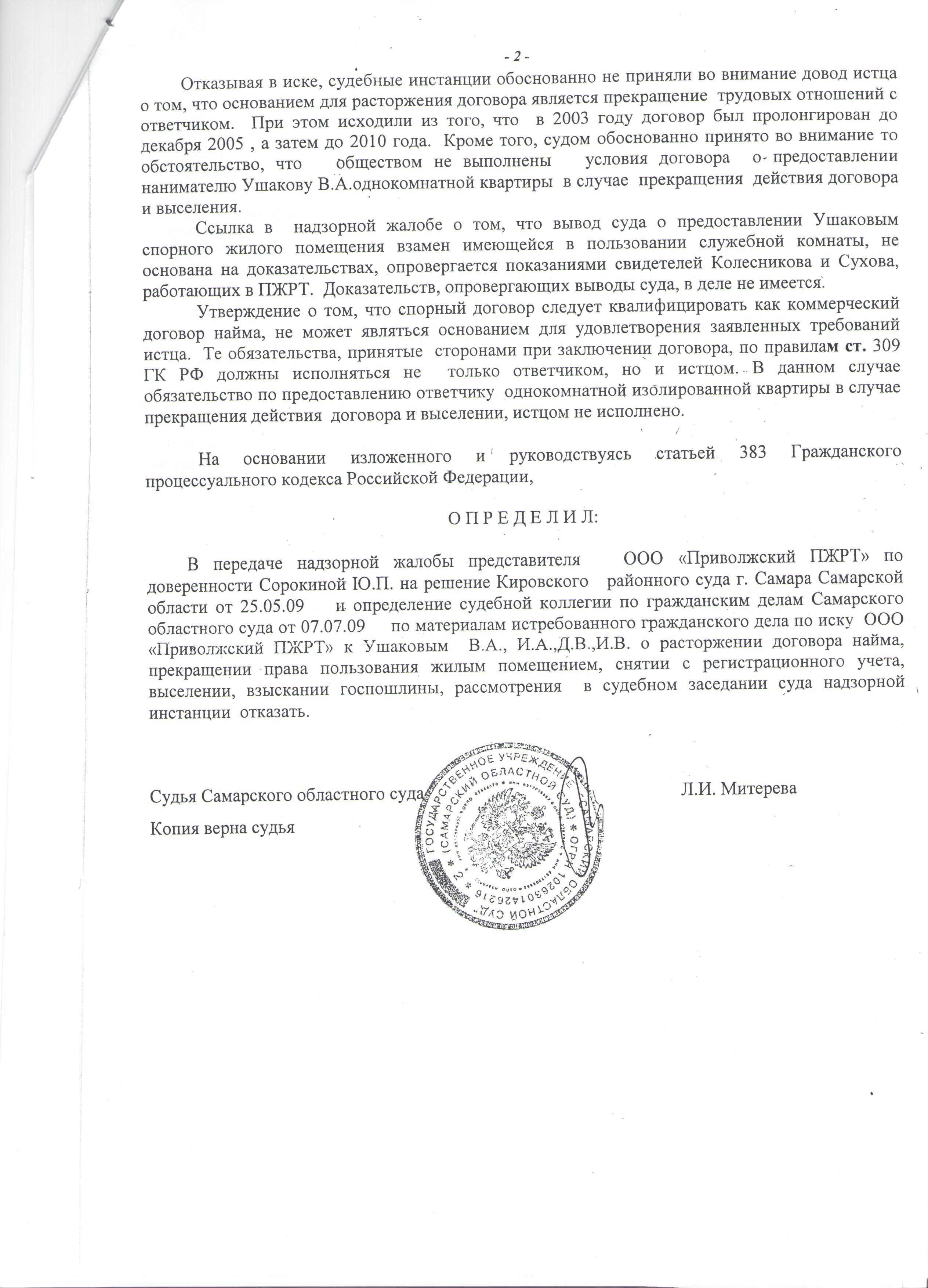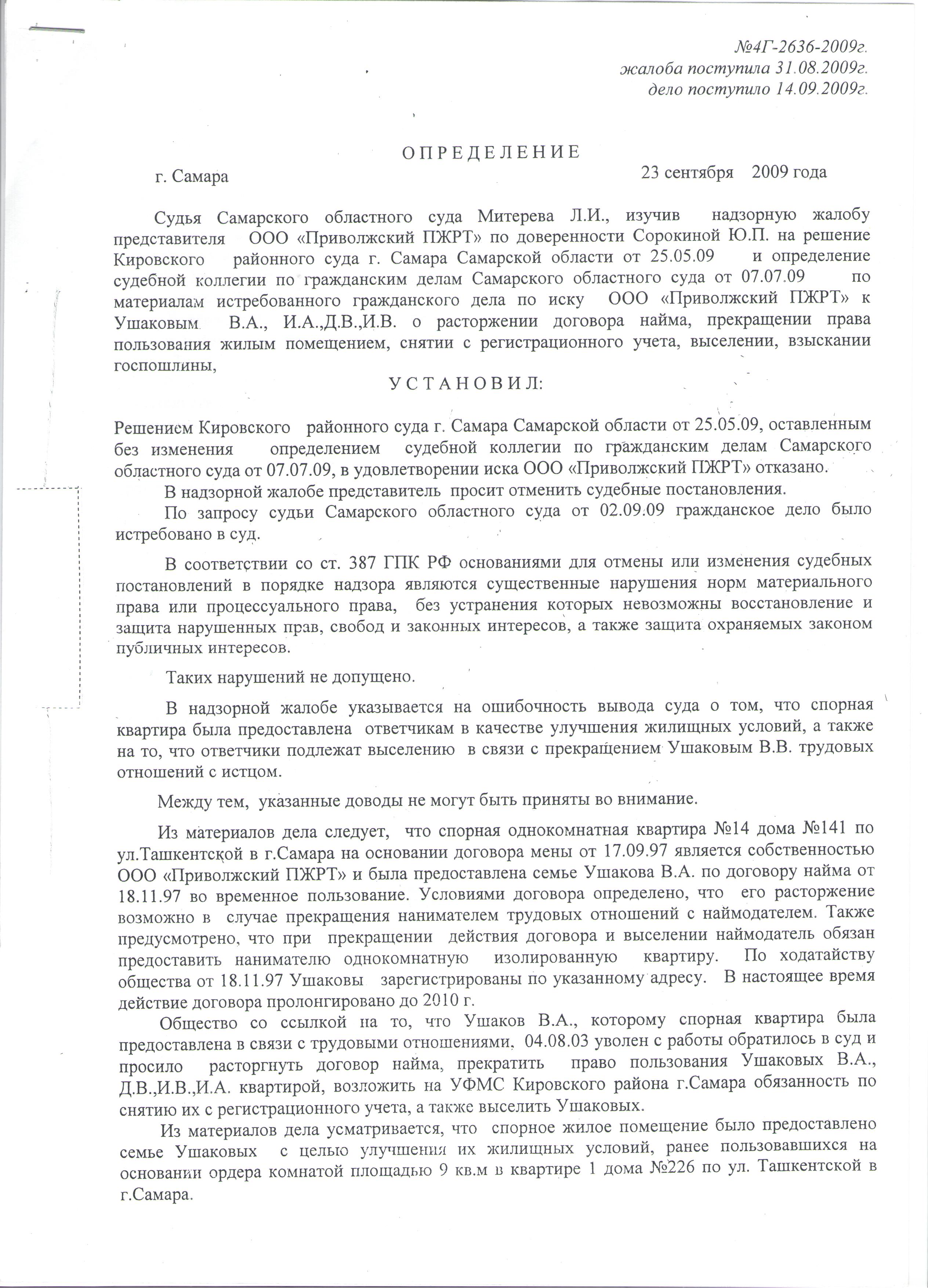 Но по договору найма, есть один пунктик согласно которому, в случае расторжения договора соц найма, наймодатель обязуется предоставить нанимателю отдельную аналогичную квартиру. Конкурсный управляющий подал в суд на Иванова и всех членов его семьи с иском снять его с регистрационного учета, расторгнуть договор соц найма (прошел срок и он уже не работает на это ООО) и выселить его из квартиры. Было много судебных заседаний, в итоге Верховный суд отказал в удовлетворении требовании, сославшись на то, что обе стороны должны выполнять условия договора, а именно ООО должно было предоставить Иванову отдельную квартиру.