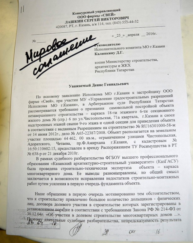 Представители «Фирмы «Свей» предлагают исполкому Казани отказаться от иска о сносе «лишних» этажей в доме №6 ЖК «Золотая середина» и подписать мировое соглашение. В своем письме (есть в распоряжении редакции «Реального времени»), адресованном руководителю исполкома Казани Денису Калинкину, застройщик формулирует следующие условия.