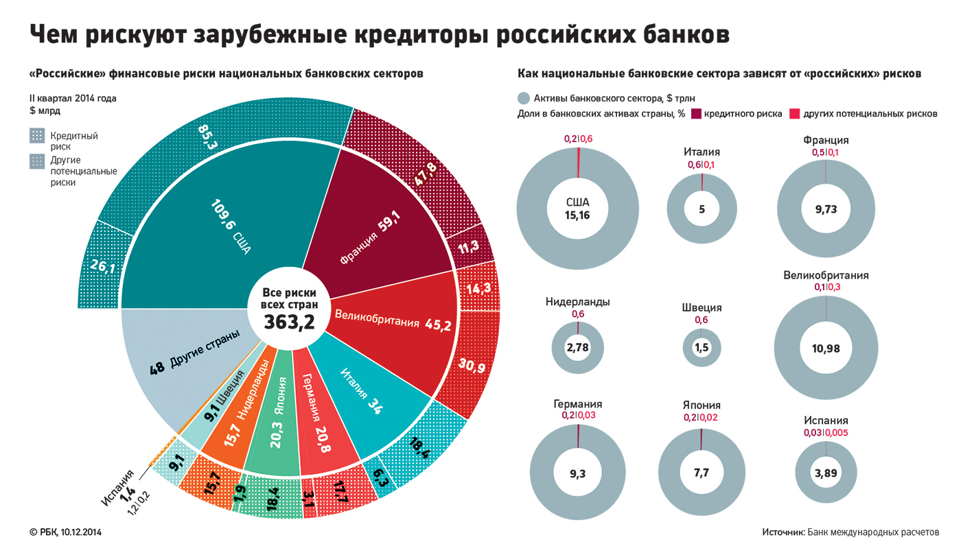 Эти суммы могут иметь большое значение для отдельных европейских банков, таких как итальянский UniCredit или французский Societe Generale, но в масштабе целых банковских секторов Европы (а также Японии и США) «российский» риск пренебрежимо мал (см. инфографику).