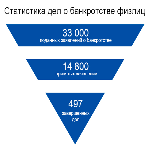 Итак, основными результатами работы этого закона за год стали всего 497 завешенных дел по банкротству (по данным сайта bankinglaw.ru). При этом в суды поступило более 33 000 заявлений, но принято к рассмотрению в 2 раза меньше – 14,8 тысяч. То есть, каждое второе заявление не принимается судом, а до конца процедуры банкротства дошло всего около 3% производств. Конечно, следует иметь в виду, что время прохождения процедуры составляет от полугода до года, поэтому большинство дел ещё находятся на стадии производства.