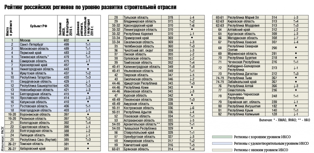 Кризисные явления в экономике продолжают оказывать негативное влияние на состояние строительной отрасли России. Об этом свидетельствуют данные Рейтингового агентства строительного комплекса (РАСК), составившего «Индекс конкурентоспособности строительной отрасли» (ИКСО) по итогам 2016 года. Хорошая и удовлетворительная ситуация наблюдается сейчас лишь на крупнейших рынках недвижимости — в Москве, Подмосковье, Санкт-Петербурге. А наиболее низкий уровень конкурентоспособности строительной отрасли отмечен в Крыму, Еврейской АО и некоторых республиках Северного Кавказа.