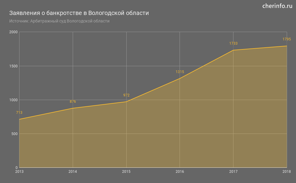 В 2018 году Арбитражный суд Вологодской области рассмотрел рекордное количество дел о банкротстве — 1480, больше половины — 787 — дела физических лиц.