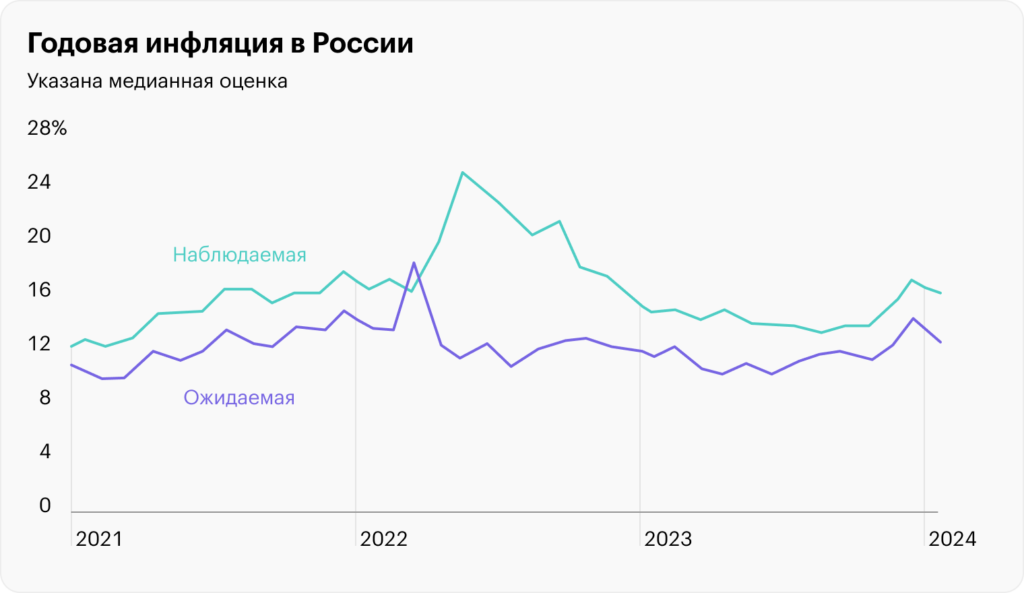 Уменьшилась и наблюдаемая инфляция — то есть то, как люди сами оценивают текущий рост цен. Россияне считают, что он составляет сейчас 16,3%. В декабре медианная оценка была на 0,7 п. п. выше.