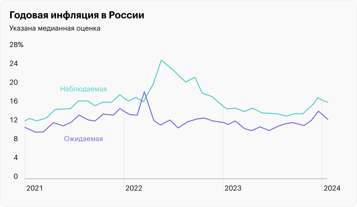 Уменьшилась и наблюдаемая инфляция — то есть то, как люди сами оценивают текущий рост цен. Россияне считают, что он составляет сейчас 16,3%. В декабре медианная оценка была на 0,7 п. п. выше.