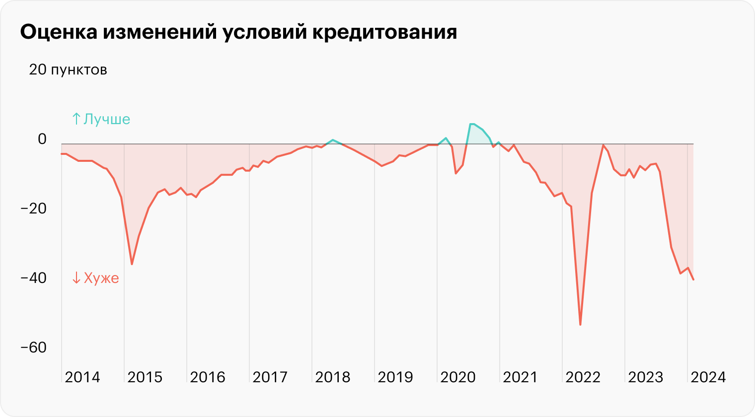 Предприниматели уже отметили ухудшение условий кредитования в январе 2024 года. Представители практически всех отраслей, за исключением розничной торговли и транспортировки, заявили об ужесточении требований к выдаче кредитов. В основном кредитная активность поддерживалась за счет льготного кредитования, например в обрабатывающей отрасли, строительстве и сельском хозяйстве.