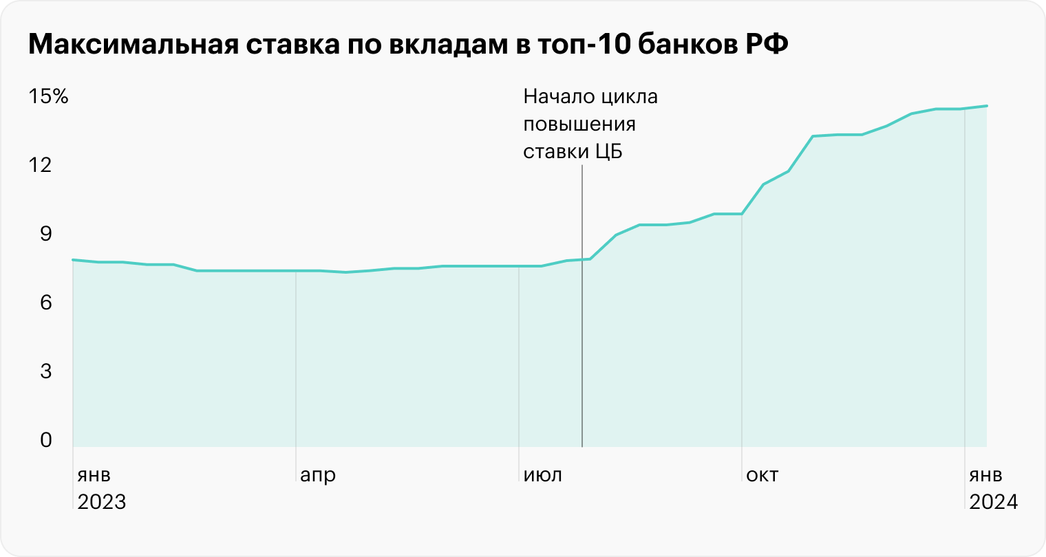 Приток денег происходит на фоне роста доходности. По данным ЦБ, максимальная процентная ставка по вкладам в топ-10 банков России во второй декаде января выросла до 14,87%, тогда как еще полгода назад была 7,83%.