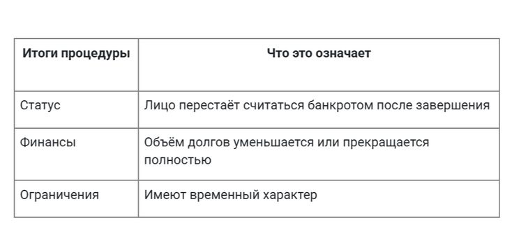 После завершения процедуры лицо получает возможность начать следующий этап. Для одних лиц это закрытие бизнеса, для других — переход в наёмную работу, для третьих — новая предпринимательская деятельность. В любом случае результатом становится прекращение давления по долгам и восстановление управляемости финансов.